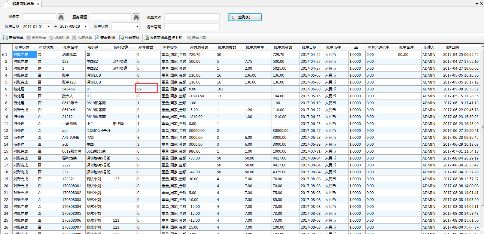 操作路径:财务结算--服务商账单管理--账单差异处理