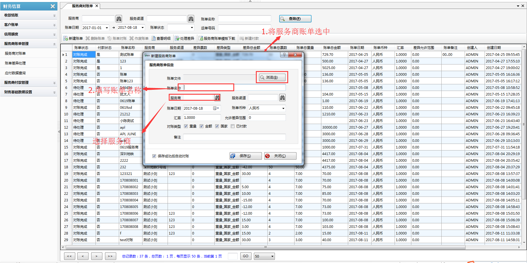 对服务商对账单里面的匹配出来的差异进行处理,具体是以服务商的为准还是以系统的为准需由财务人员选择。